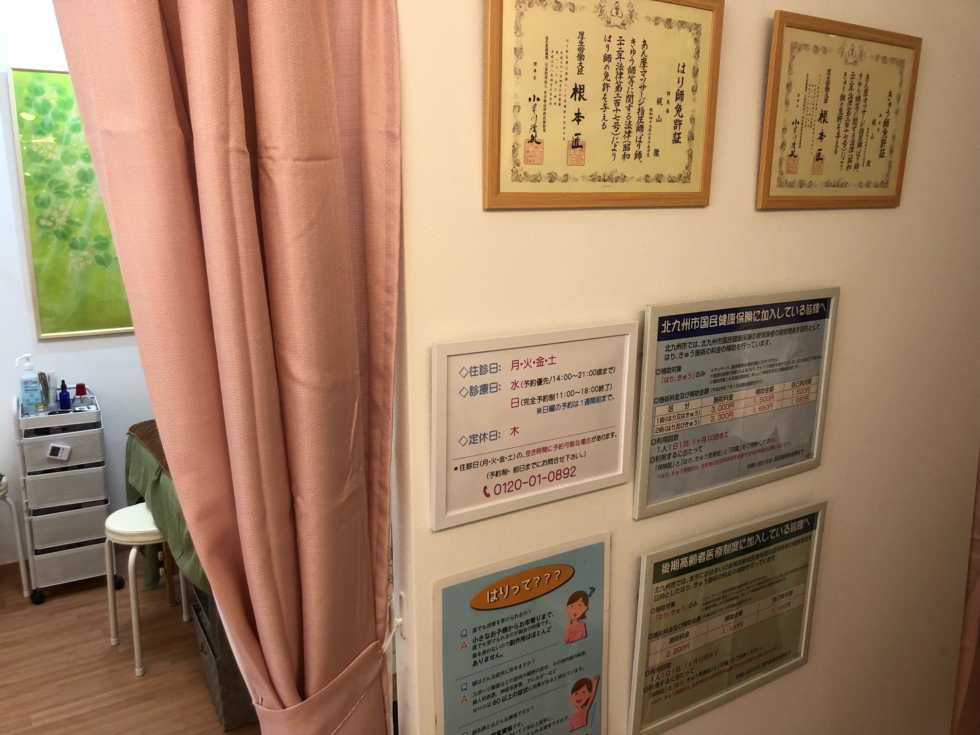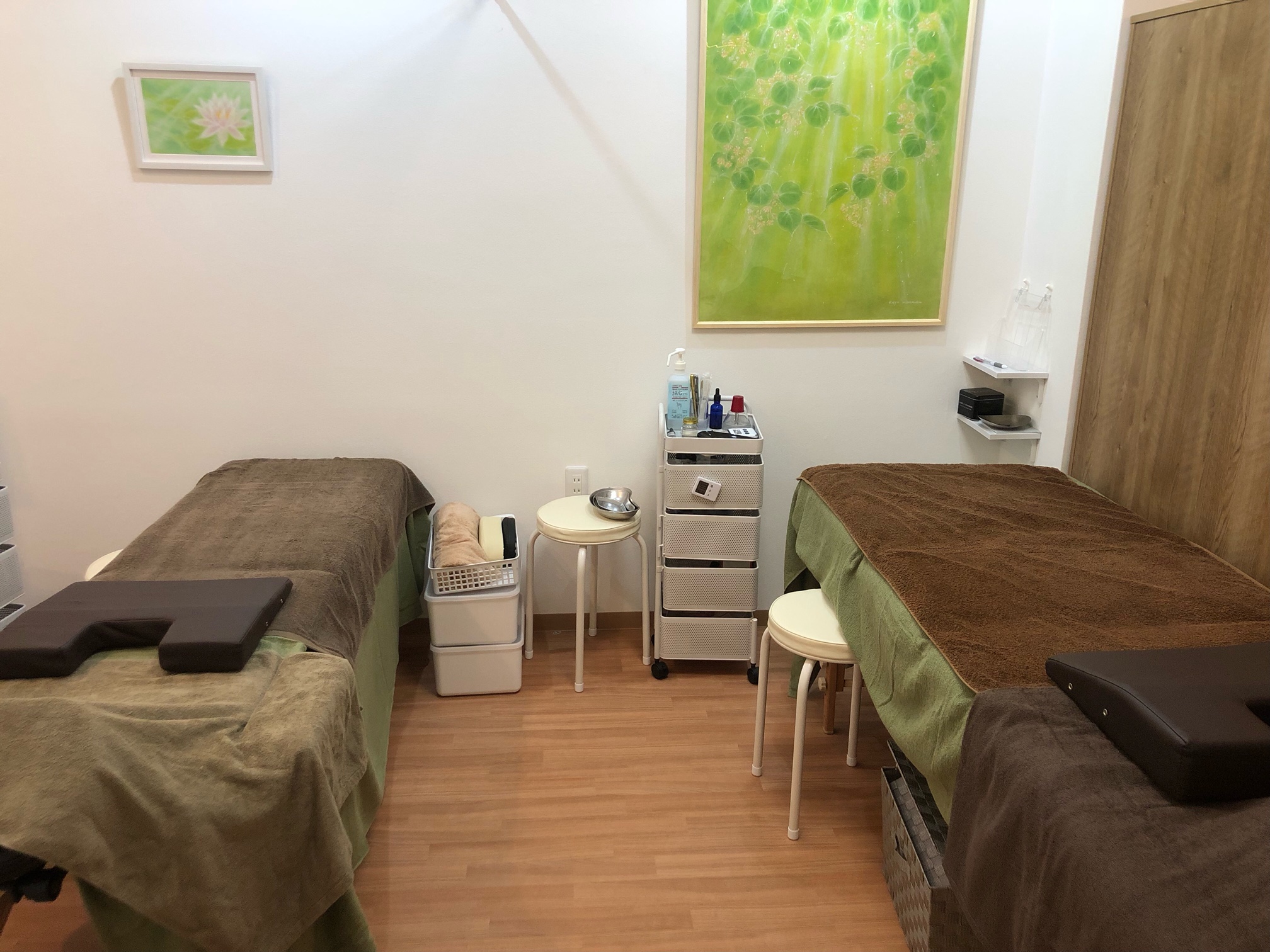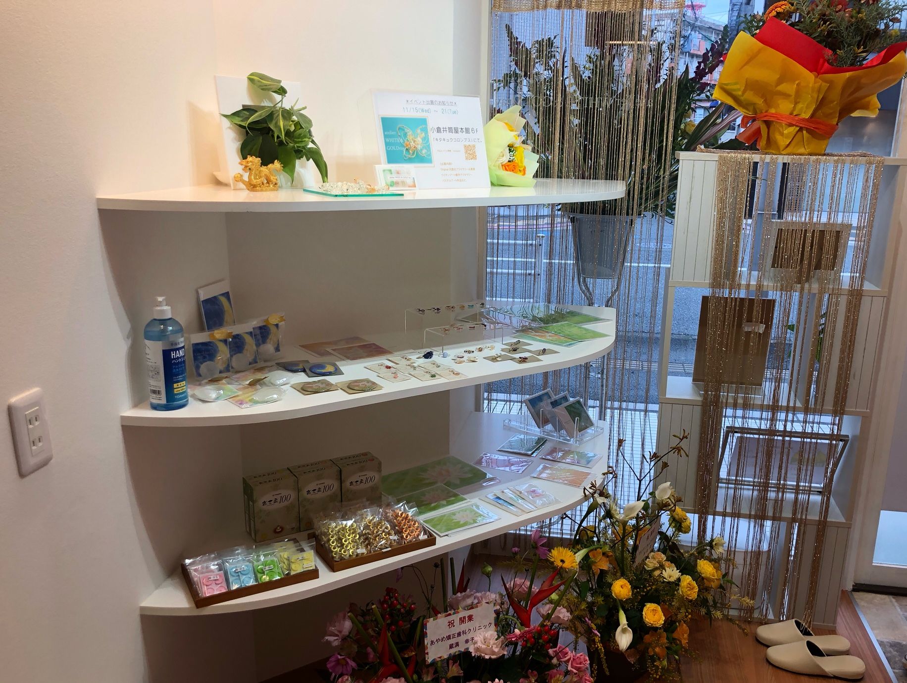 店舗外観(夜) 夜遅くに来られる患者さんの為に、外観はライトアップ中!(要予約!) 店舗内入口 天然石やワイヤーアートを創作している中村佳世さんの【atelierWHITE&GOLDray】の作品を展示販売行っています。小倉井筒屋に定期出店されてる作家さんです。 待合室 待合室から施術室入口です。 施術室 施術室内です。【ベッド2台】