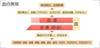 ?血の症状:肩凝り、頭痛、冷えのぼせ、皮下出血やあざのできやすさ、肌の暗色化、女性の場合は生理痛や生理不順、不正性器出血